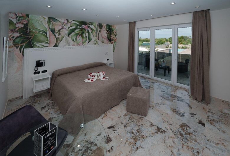 Il letto matrimoniale, con la sua copertura in toni neutri, è posizionato al centro della stanza, creando un ambiente accogliente e rilassante. Le ampie finestre conducono a un balcone privato, da cui è possibile godere di una splendida vista sulla piscina, ideale per rilassarsi e godersi la tranquillità.